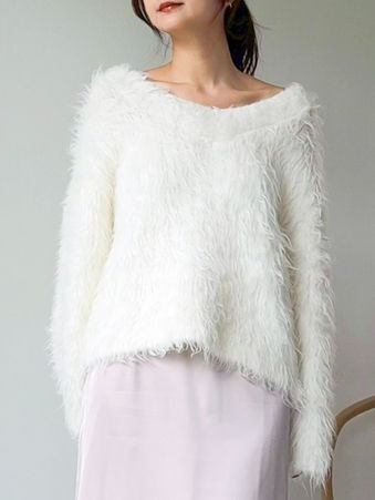 毛足長めのふわふわニットは、Vネックですっきりと見え小顔効果を発揮。