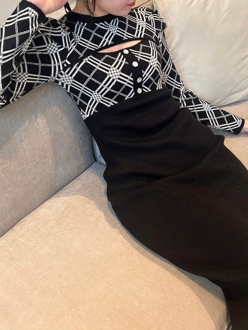 程よく身体にフィットしたシルエットがボディラインを綺麗に見せてくれます。 胸元からちらっと肌見せもあり、 あざとモテニットワンピースです。