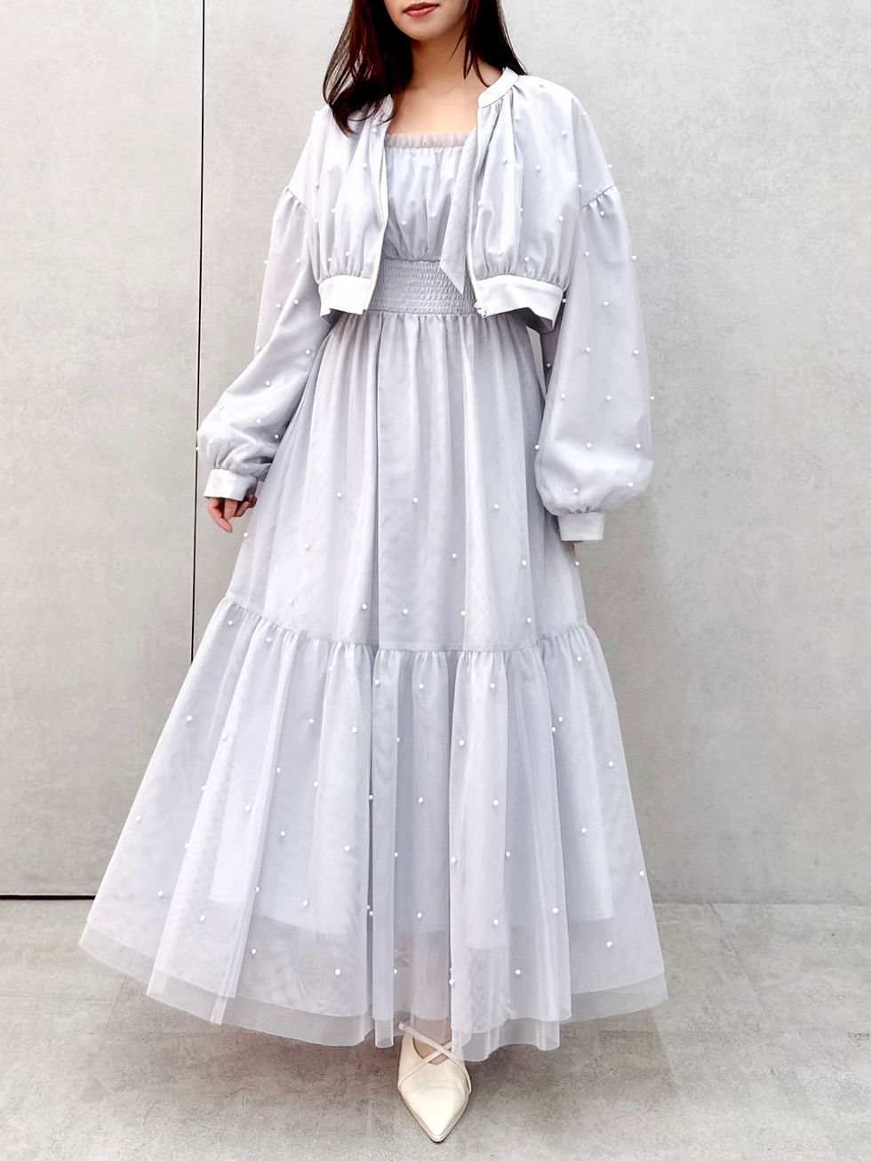 透け感のあるチュール素材に、パールを散りばめた上品で華やかなアイテムです